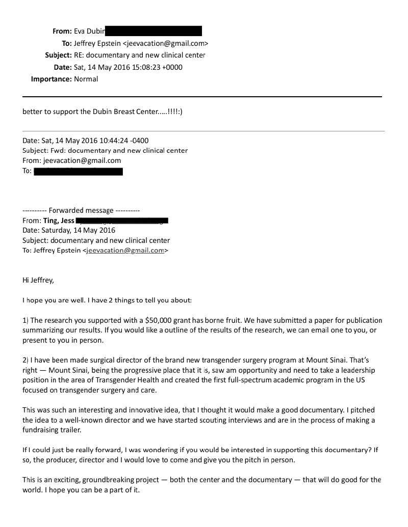 Zwei weitere E-Mails hinterlassen einen ähnlich irritierenden Eindruck. Es geht um Jess Ting, Chirurg für Transgender-Operationen, welche auch an Minderjährigen durchgeführt wurden. Jess Ting ist einer der Chirurgen, die die „Transgender-Aktivistin“ Jazz Jennings begleitet und schließlich im Alter von 17 Jahren operiert hatten.